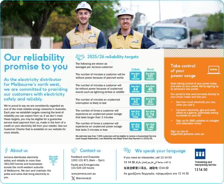 At Jemena, our customers and communities are at the heart of what we do. Every day we work to bring energy to your life, including delivering on a number of promises to you through our Customer Charter.