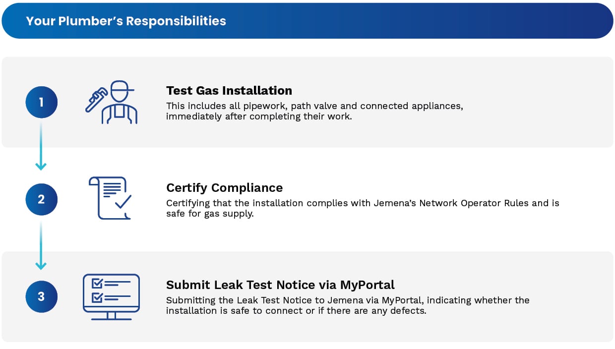 Jemena cannot connect or reconnect your gas supply until a valid Leak Test Notice has been received. This requirement is in place to ensure the safety of your household, your property, and the wider community. It is a legal obligation under the Gas Supply Regulation and forms part of our commitment to maintaining a safe and reliable gas network.