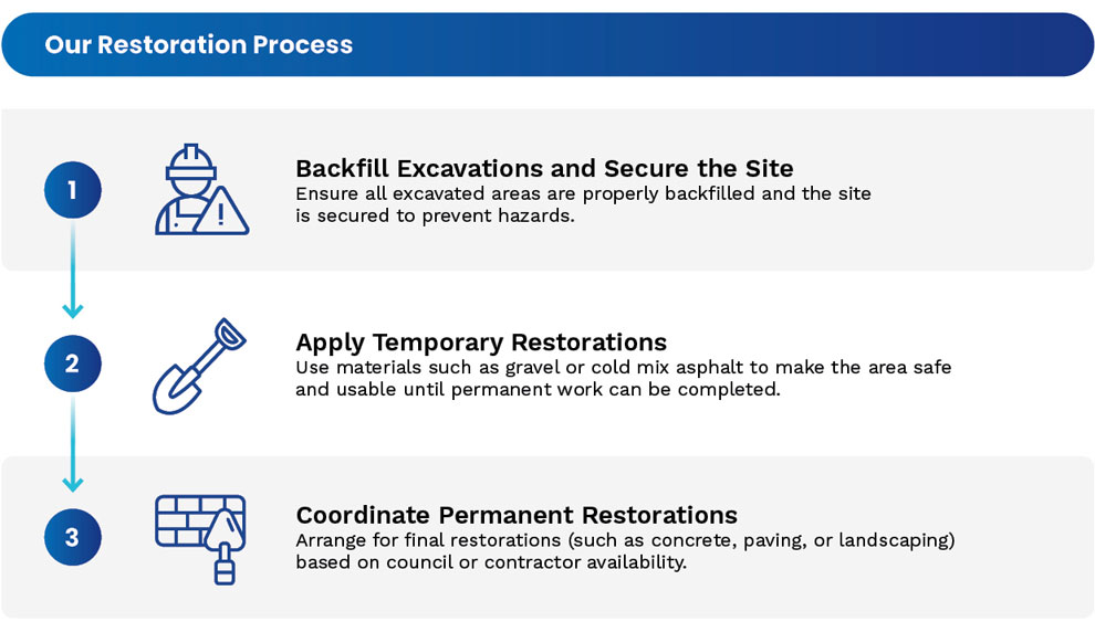 When Jemena carries out gas works, such as new connections, safety upgrades, or network repairs/maintenance, excavation may be required. This can temporarily affect surfaces like driveways, footpaths, lawns, or gardens. We understand this can be inconvenient and are committed to restoring all affected areas as close as possible to their original condition.